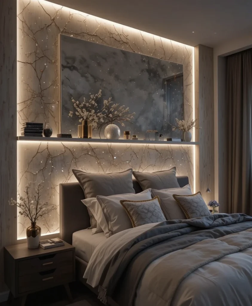 Hidden LED strips behind headboards or shelves create a soft, celestial glow. This modern lighting technique is essential to celestial bedroom ideas 2026, enhancing ambiance without visible fixtures. Adjustable colors allow the mood to shift effortlessly from calming to dramatic.