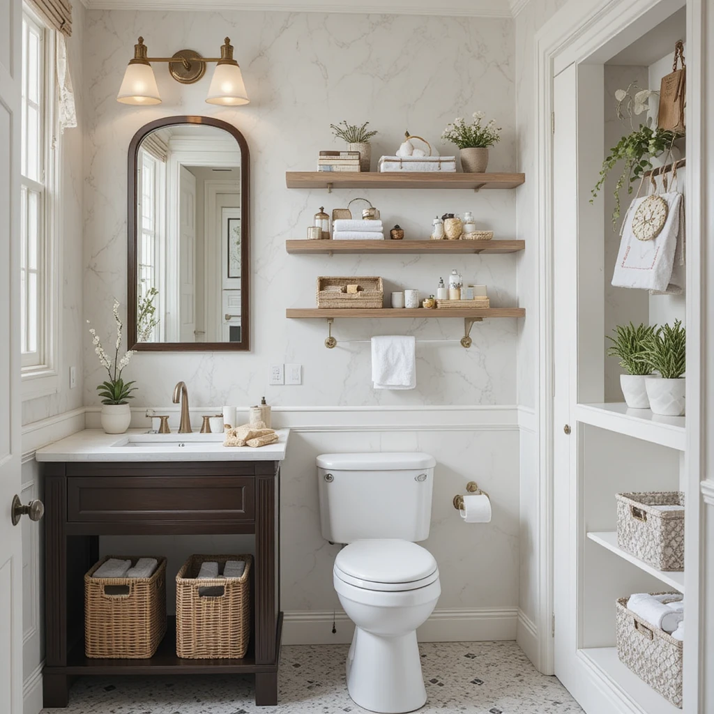 Functional storage can be striking when done creatively. Floating shelves, woven baskets, and niche built-ins keep essentials accessible while adding style. This thoughtful approach keeps your chic bathroom makeover organized and visually appealing.