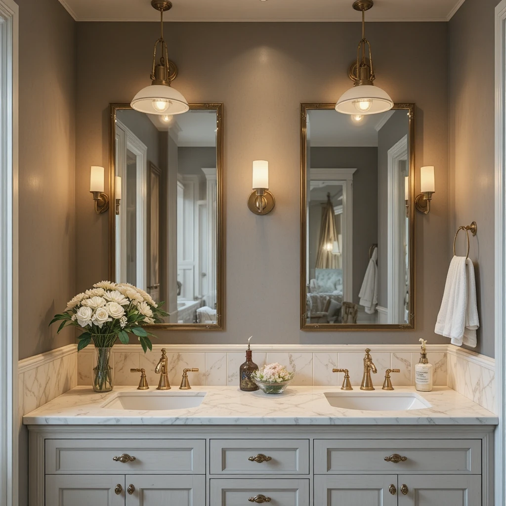 Round mirrors soften the visual edges of the space while offering a stylish, modern lift. Oversized designs reflect more light, making the bathroom brighter and more expansive. This simple addition significantly enhances your chic bathroom makeover.