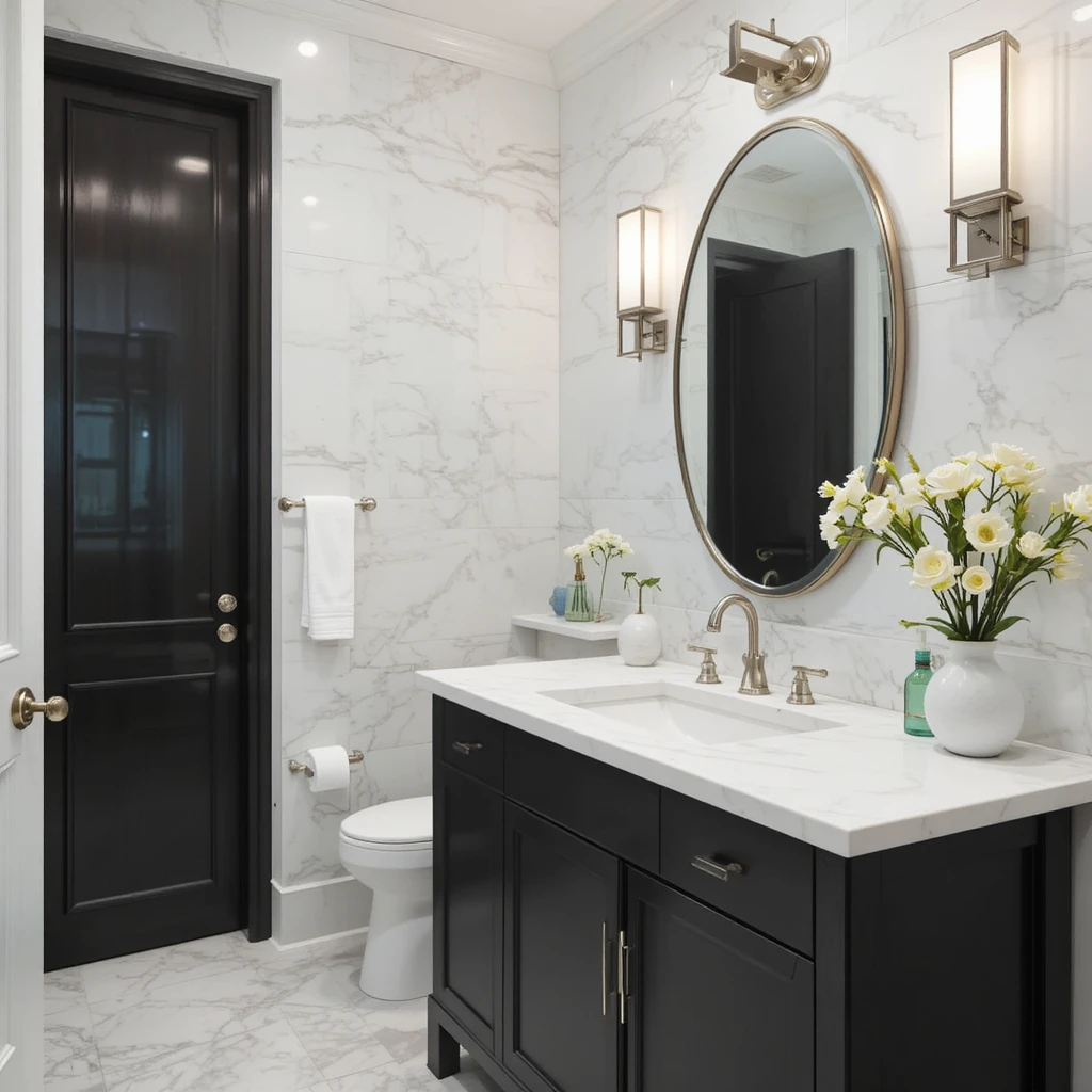 Bold matte black faucets and hardware give your bathroom a strong, modern personality. These fixtures effortlessly contrast with bright surfaces, adding depth and structure. They elevate your chic bathroom makeover with a subtle touch of drama.