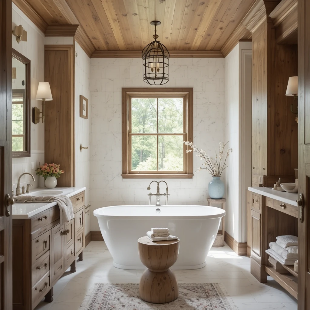 Wood elements add organic warmth that balances polished surfaces. Whether through cabinetry, stools, or ceiling details, wood creates a grounded elegance. This natural touch adds depth to your chic bathroom makeover.