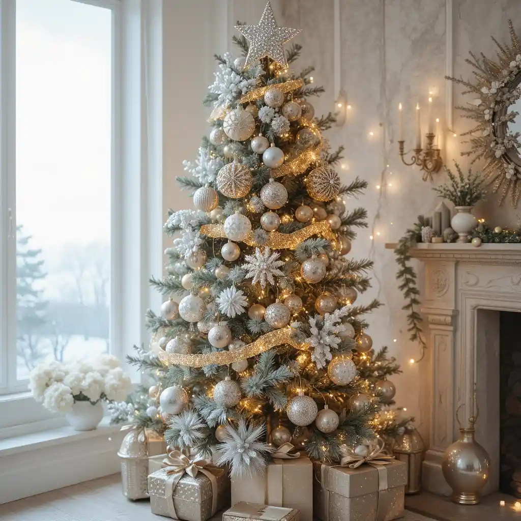 Cover your tree with glittery ornaments, sparkling garlands, and shimmering toppers. A glitter tree catches the light beautifully, making your space glow with festive charm.