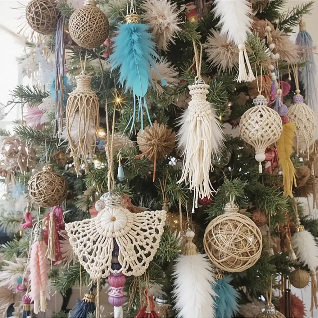 Macramé ornaments, feathers, and eclectic colors create a laid-back yet stylish tree. A boho design feels creative, cozy, and effortlessly unique.