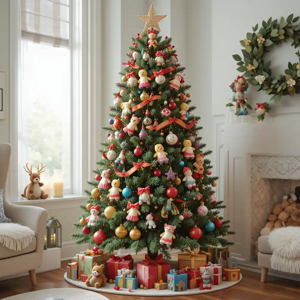 Fill your tree with miniature toys, stuffed animals, and colorful ribbons for a playful theme. This design is perfect for families with children who love a fun holiday atmosphere.