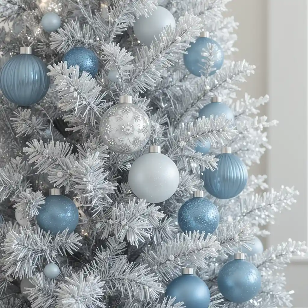 Combine icy blue ornaments with silver tinsel and frosted branches. This elegant palette brings a wintery sparkle that looks both luxurious and calming.