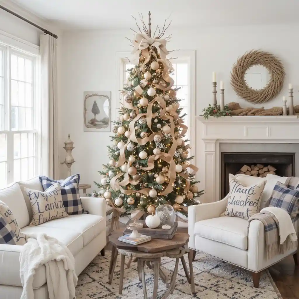 Bring rustic charm to your living room with burlap ribbons, wooden ornaments, and neutral tones. A farmhouse-style tree looks inviting and pairs beautifully with cozy plaid blankets and wooden accents.