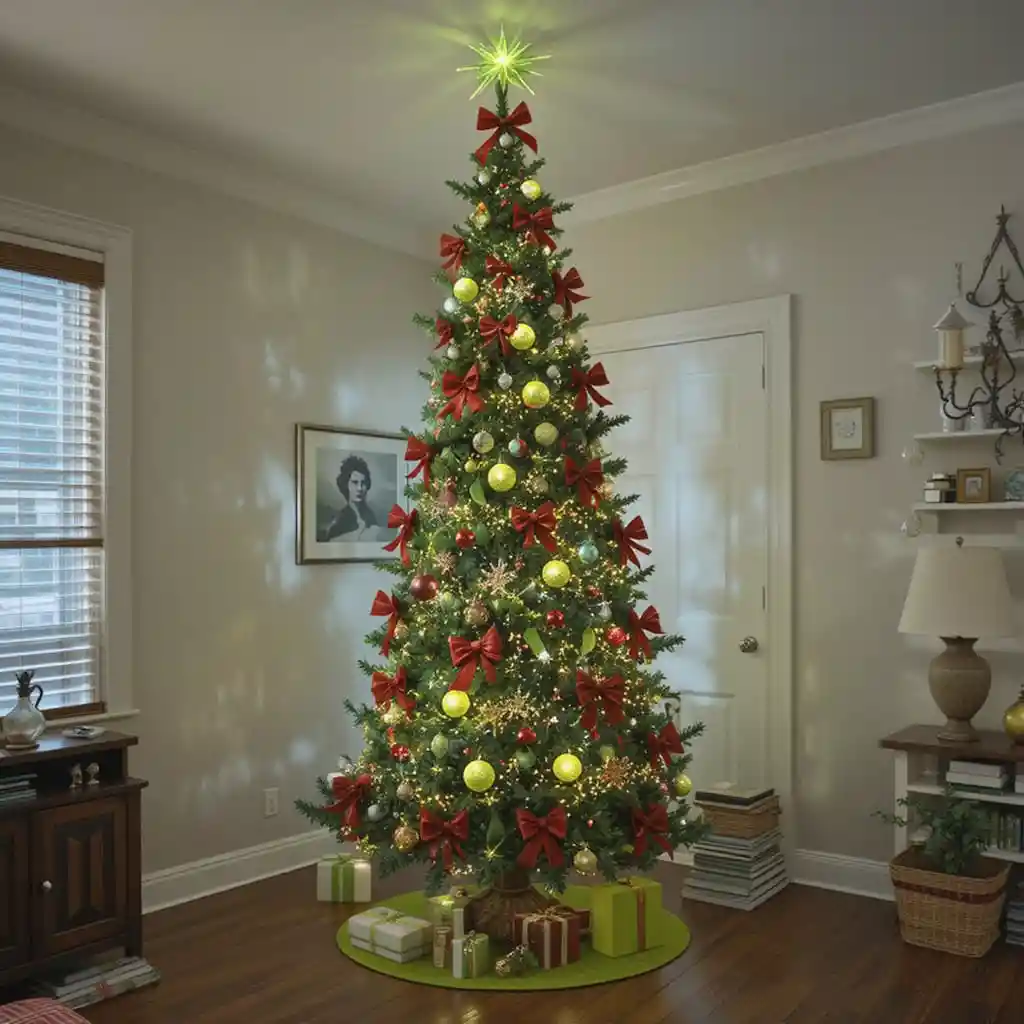 Twist your tree sideways, add lime green decorations, and place red bows for a fun Grinch theme. It’s quirky, whimsical, and guaranteed to make guests smile.