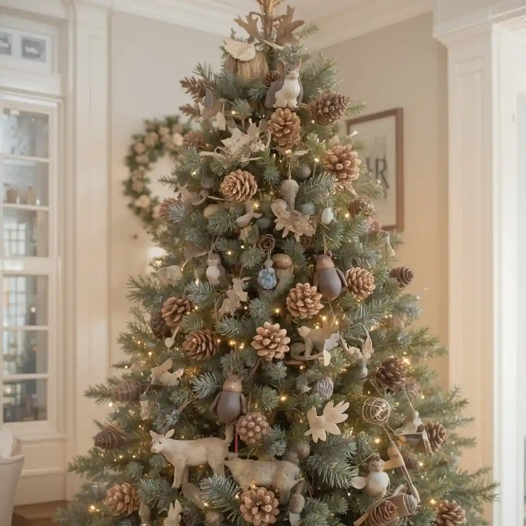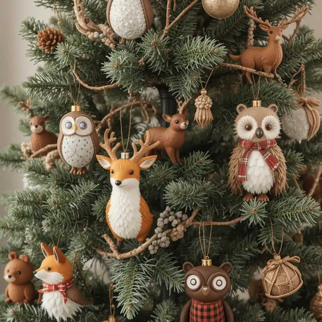 Add fox, deer, owl, and bear ornaments to create a forest-inspired holiday design. This style is cozy and inviting, especially paired with plaid and natural greenery.