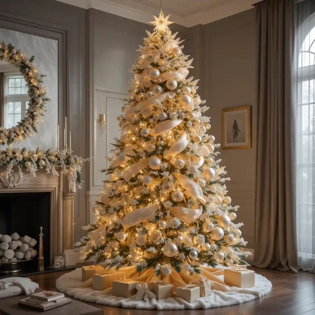 For a luxurious finish, style your tree with champagne gold ornaments, satin ribbons, and crystal garlands. The soft golden glow creates a sophisticated and glamorous holiday atmosphere.