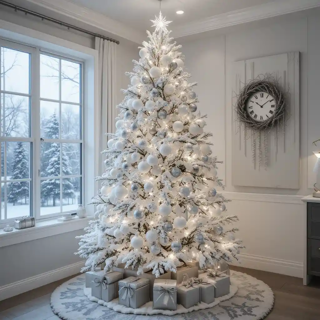 For a snowy effect indoors, decorate your tree with white ornaments, faux snow, and silver accents. The frosty tones create a magical winter wonderland that feels chic and calming.