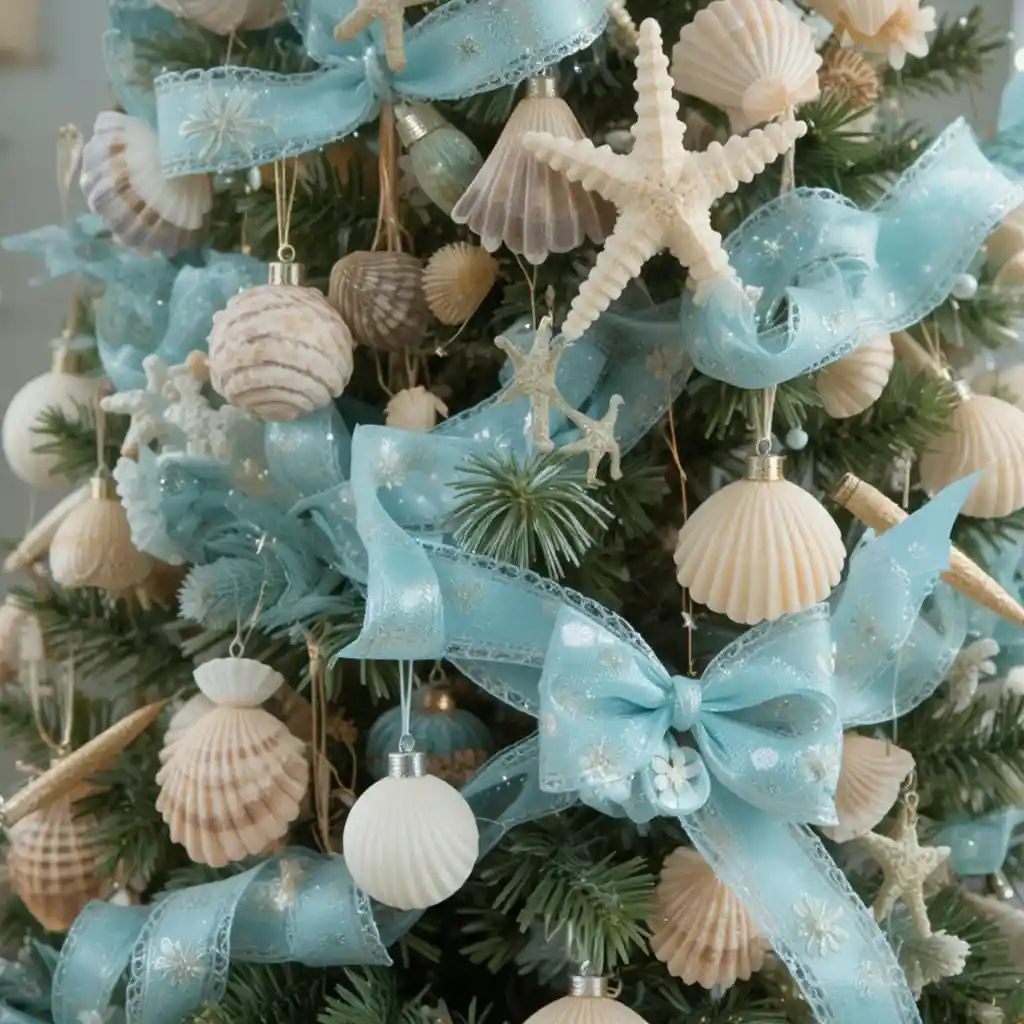 Add seashell ornaments, aqua ribbons, and starfish toppers for a beach-inspired holiday. A coastal Christmas tree feels fresh, light, and perfect for anyone who loves the ocean.