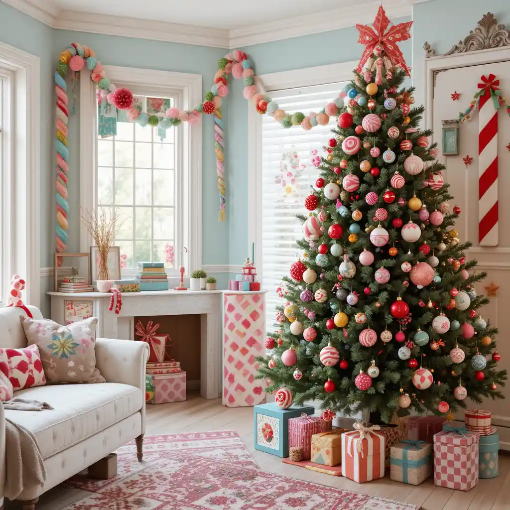 Bright colors, candy cane ornaments, and oversized lollipops turn your tree into a sweet wonderland. This whimsical style is especially fun for kids and creates a playful holiday vibe.