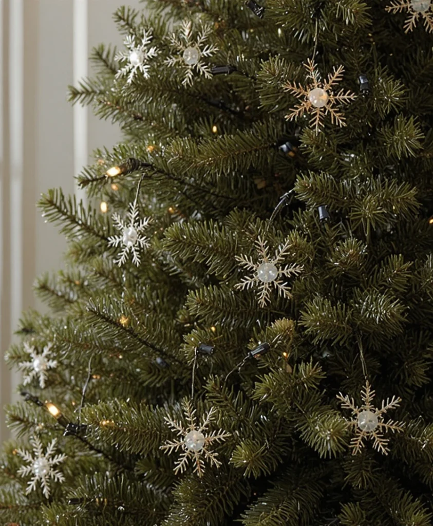 Snowflake-shaped lights emphasize a wintry theme. This design adds charm and seasonal character, perfect for trees in homes that celebrate snowy, festive atmospheres.
