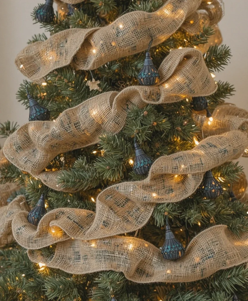 Integrate burlap ribbons with warm string lights for a rustic, farmhouse aesthetic. This pairing creates a cozy, homey environment, perfect for enhancing your Christmas tree string ideas with a handcrafted touch.