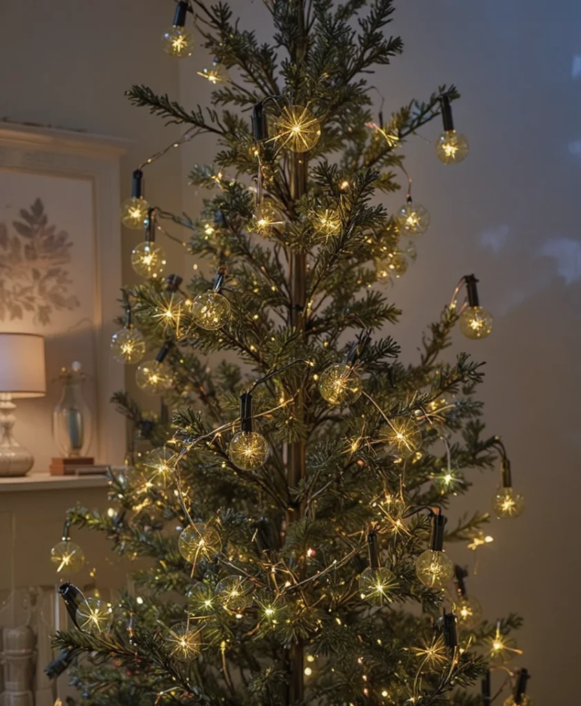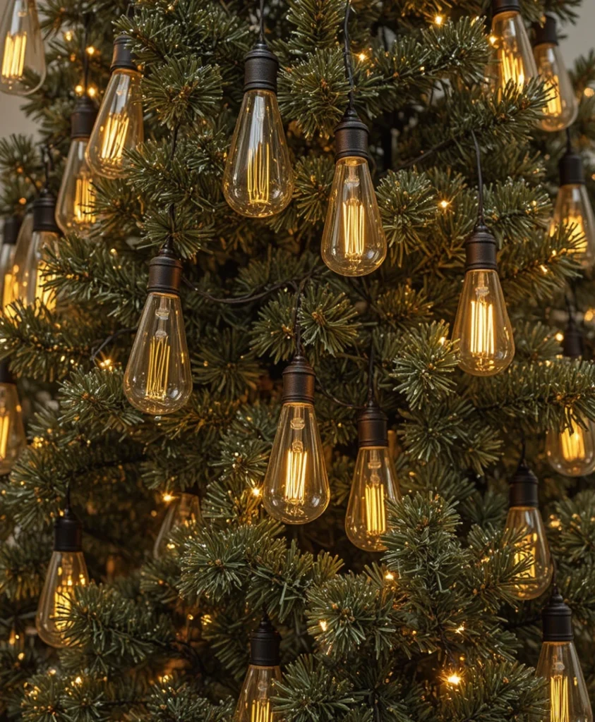 Incorporate antique-style Edison bulbs to bring a retro feel to your tree. These bulbs emit a soft amber glow, offering a nostalgic and artistic touch to your Christmas tree string ideas.