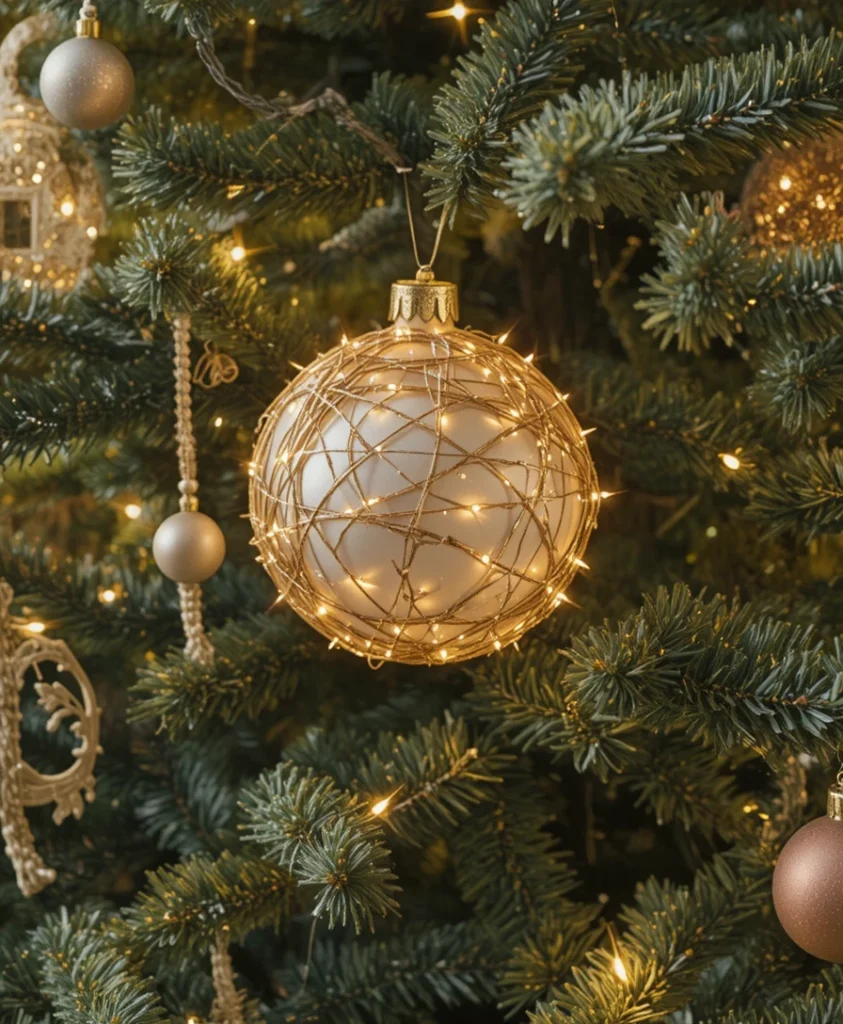 String lights encased in delicate beads scatter the glow in intricate patterns. These beads enhance reflection and texture, giving a sophisticated, almost jewel-like appearance to the tree.