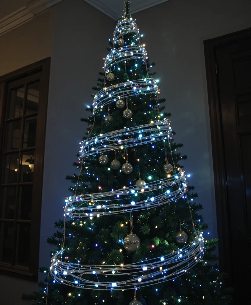 Arrange strings in a layered spiral pattern from top to bottom. This structured approach gives a polished, professional look while evenly distributing light, perfect for a cohesive and eye-catching tree display.