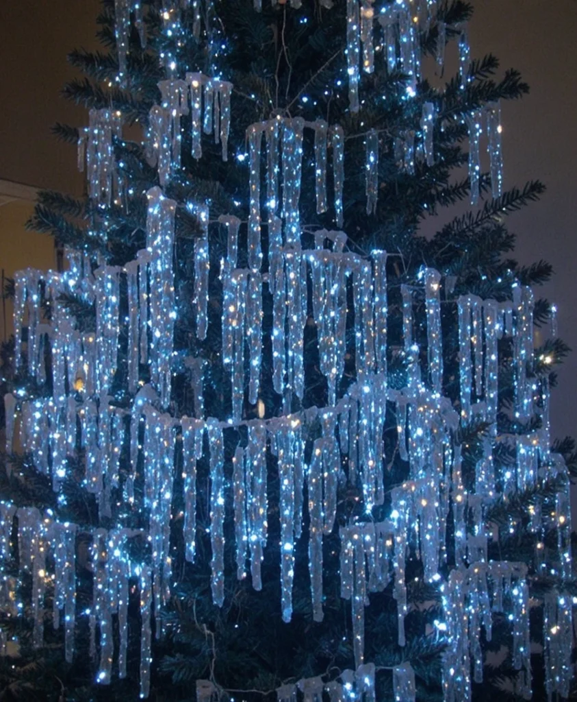 Icicle string lights hang vertically, creating a cascading waterfall effect. This design gives the tree a frosted, magical appearance, perfect for enhancing winter-themed Christmas tree string ideas.