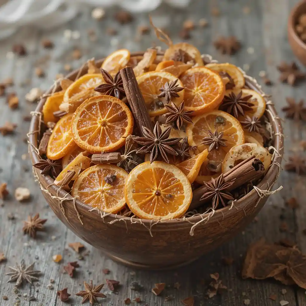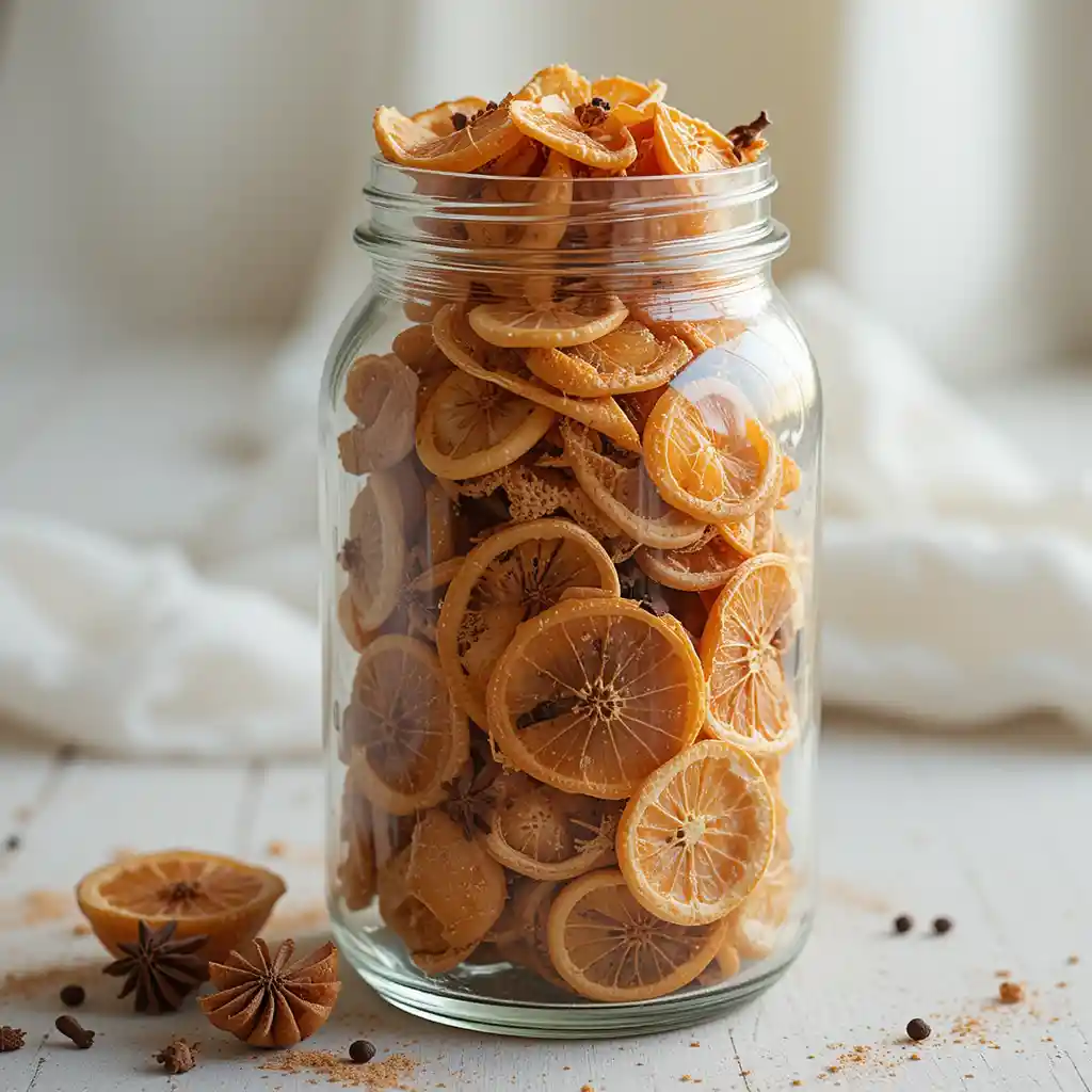 Fill clear jars with dried orange, apple rings, and spices like cloves. Set them on side tables or shelves for both decoration and aroma.