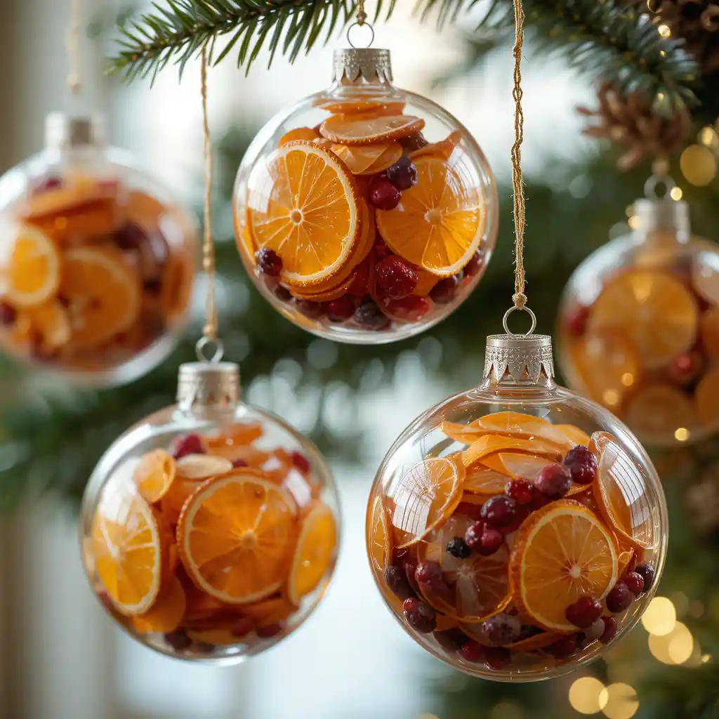 Fill transparent baubles with dried citrus slices or cranberries. These ornaments capture the beauty of nature while shining under Christmas lights.