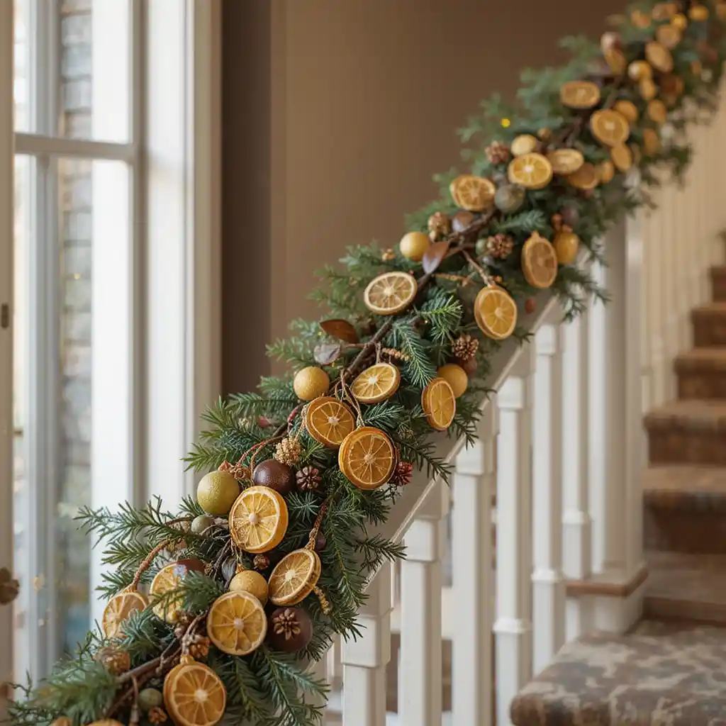 Attach dried citrus slices to evergreen branches tied with ribbon. Hang them on doorways, windows, or even along stair railings.