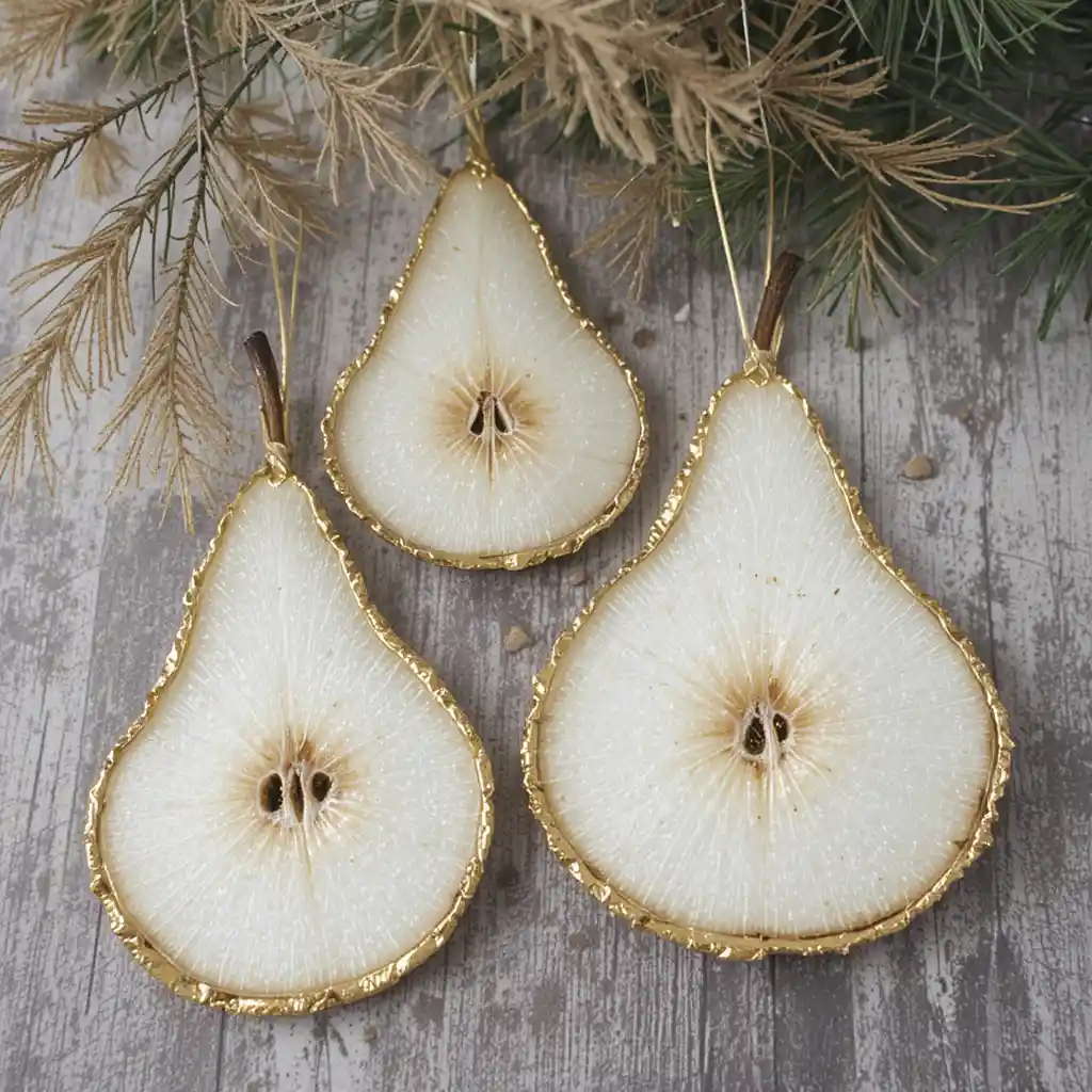 Dry thin pear slices and edge them with gold paint for a luxe finish. They create a sophisticated look while maintaining natural beauty.