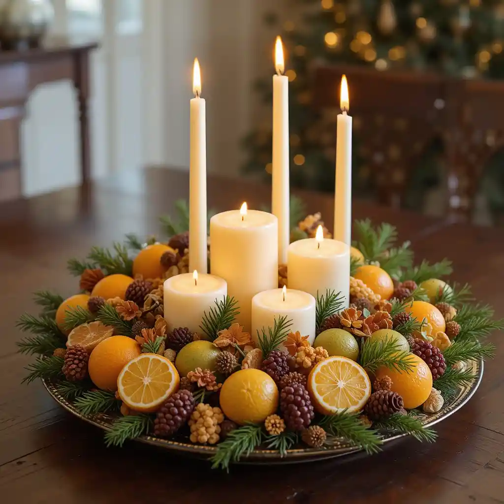 Arrange dried fruits around a candle tray, mixing in pine sprigs for greenery. This centerpiece transforms a dining table into a festive focal point.