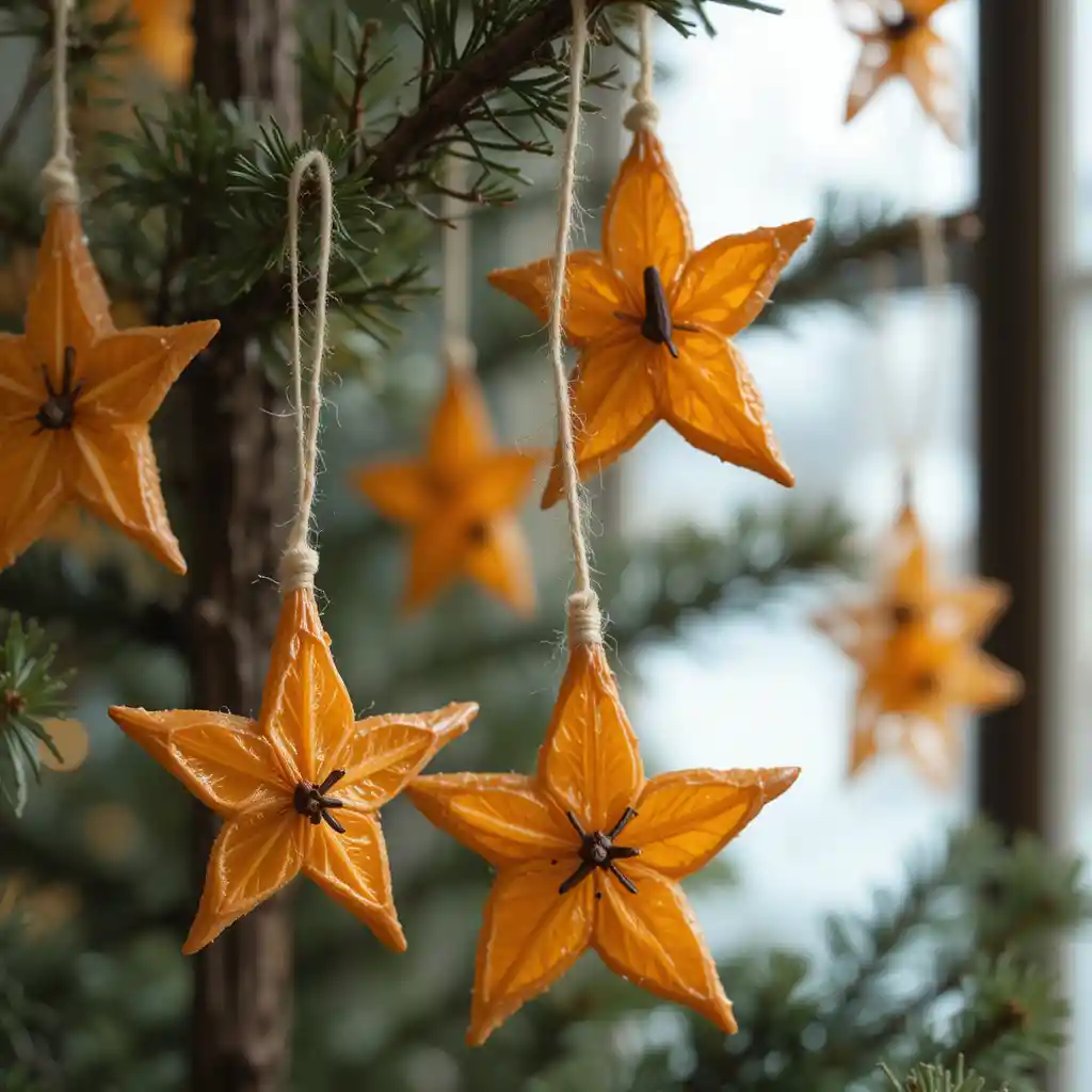 Dry oranges cut into star shapes and stud them with whole cloves. Their sweet-spicy aroma enhances tree branches or window displays.