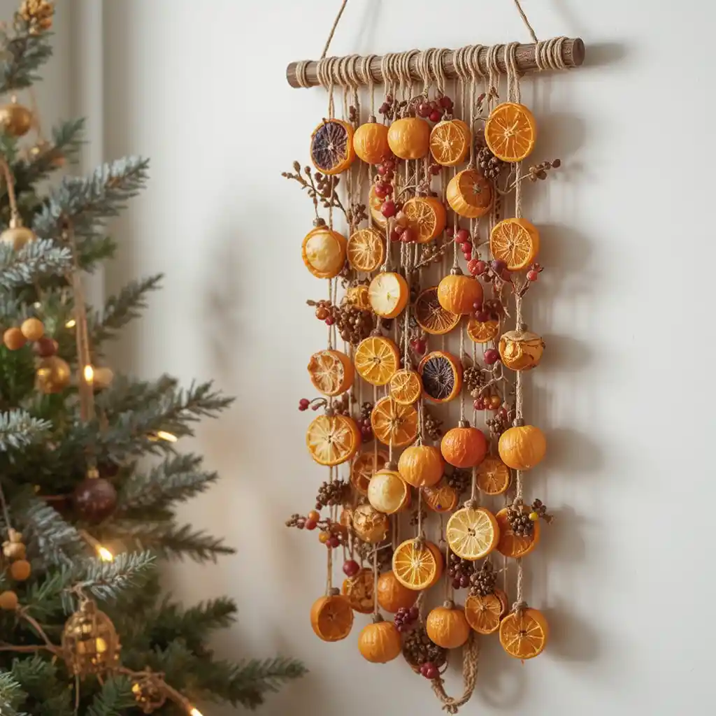 Create a vertical wall hanging with dried oranges, apples, and berries strung on twine. This piece feels earthy and artistic, complementing minimal décor.