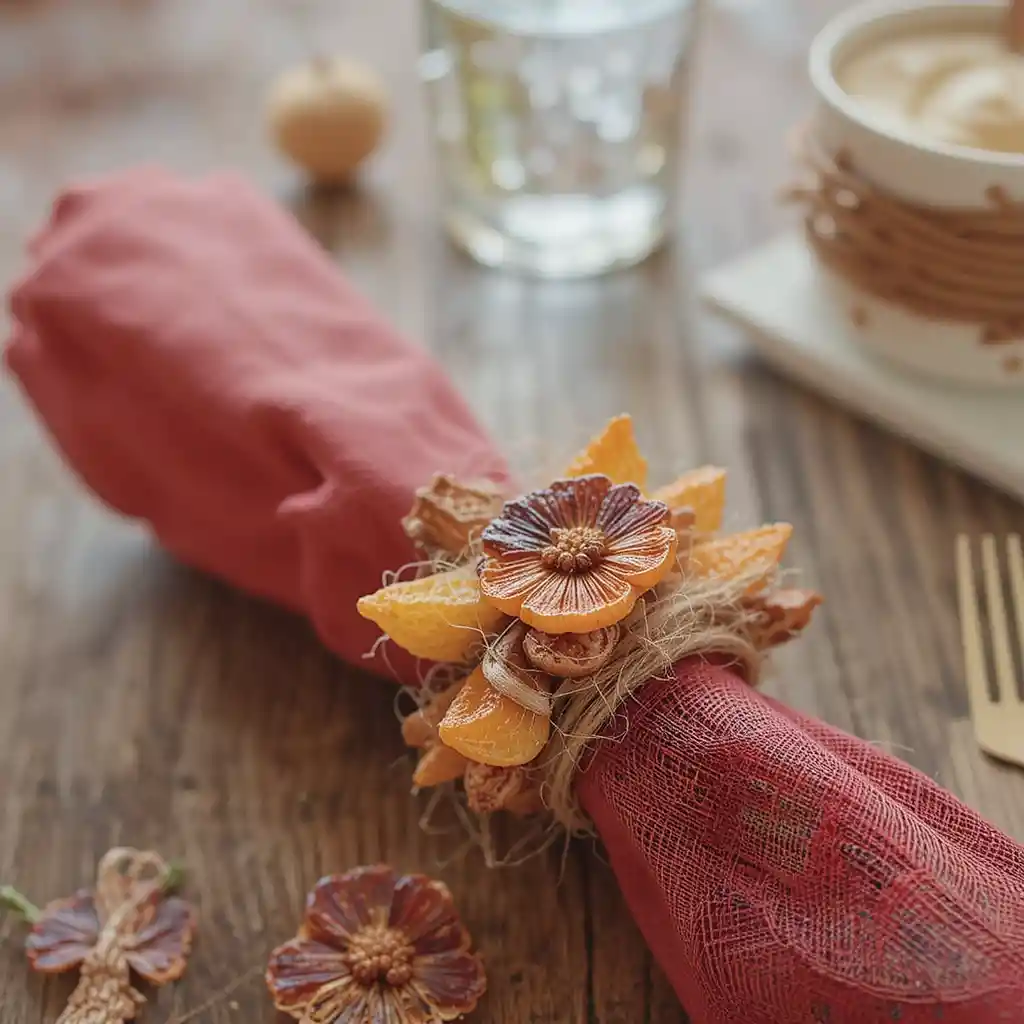 Attach dried fruit slices to small loops of twine or ribbon to craft napkin rings. These give your dinner table a personal, rustic finish.