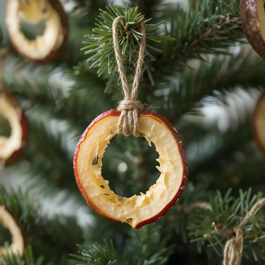 Thinly sliced dried apples, tied with jute string, make lovely ornaments. Their rustic red edges bring soft color, making them perfect for a tree with farmhouse or vintage style.