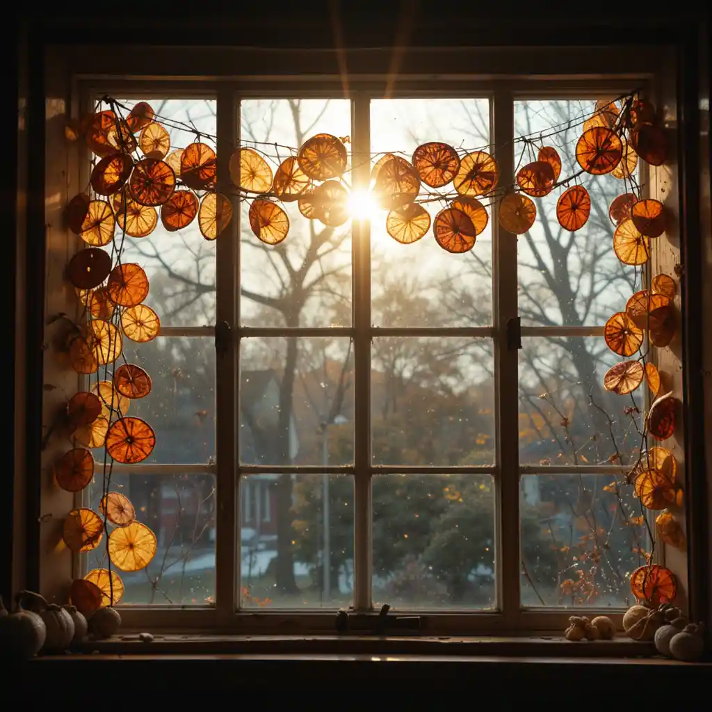Thread dried citrus slices together and drape across windows. The sunlight passing through them creates glowing jewel tones.