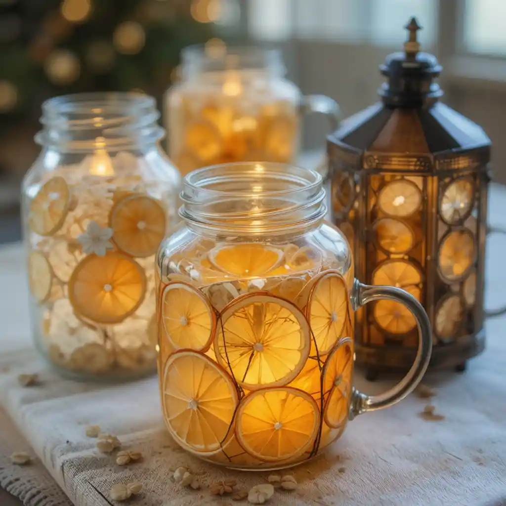 Dried lemon slices can be arranged around candle jars or lanterns. Their golden glow shines through, adding a cozy brightness to your Christmas evenings.
