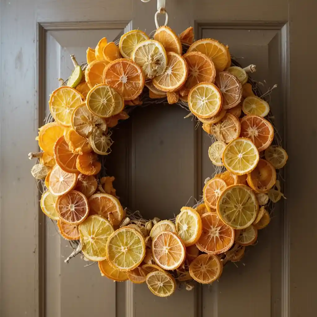 Combine dried orange, lime, and lemon slices on a grapevine wreath base. This natural piece creates an aromatic and cheerful entrance for your guests.
