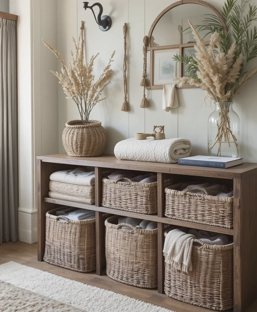 Storage in an Earthy Cozy Bedroom doesn’t have to be boring. I use woven baskets for blankets, books, or even laundry. They keep the room organized while adding texture and a natural aesthetic.