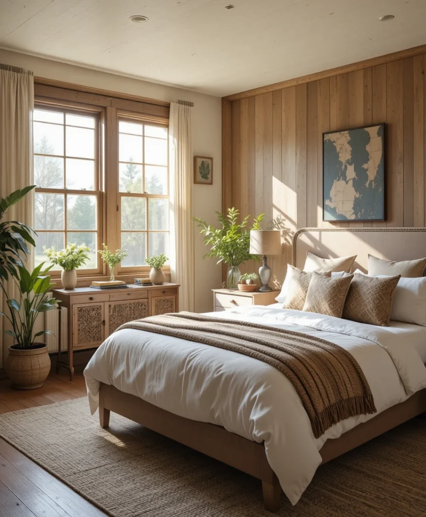 I always start my Earthy Cozy Bedroom with raw or reclaimed wood. Whether it’s a bed frame, nightstand, or exposed beams, wood instantly brings warmth and authenticity. I prefer imperfect finishes—knots, grains, and textures that feel untouched and real. It creates a grounded base that anchors the entire space beautifully.