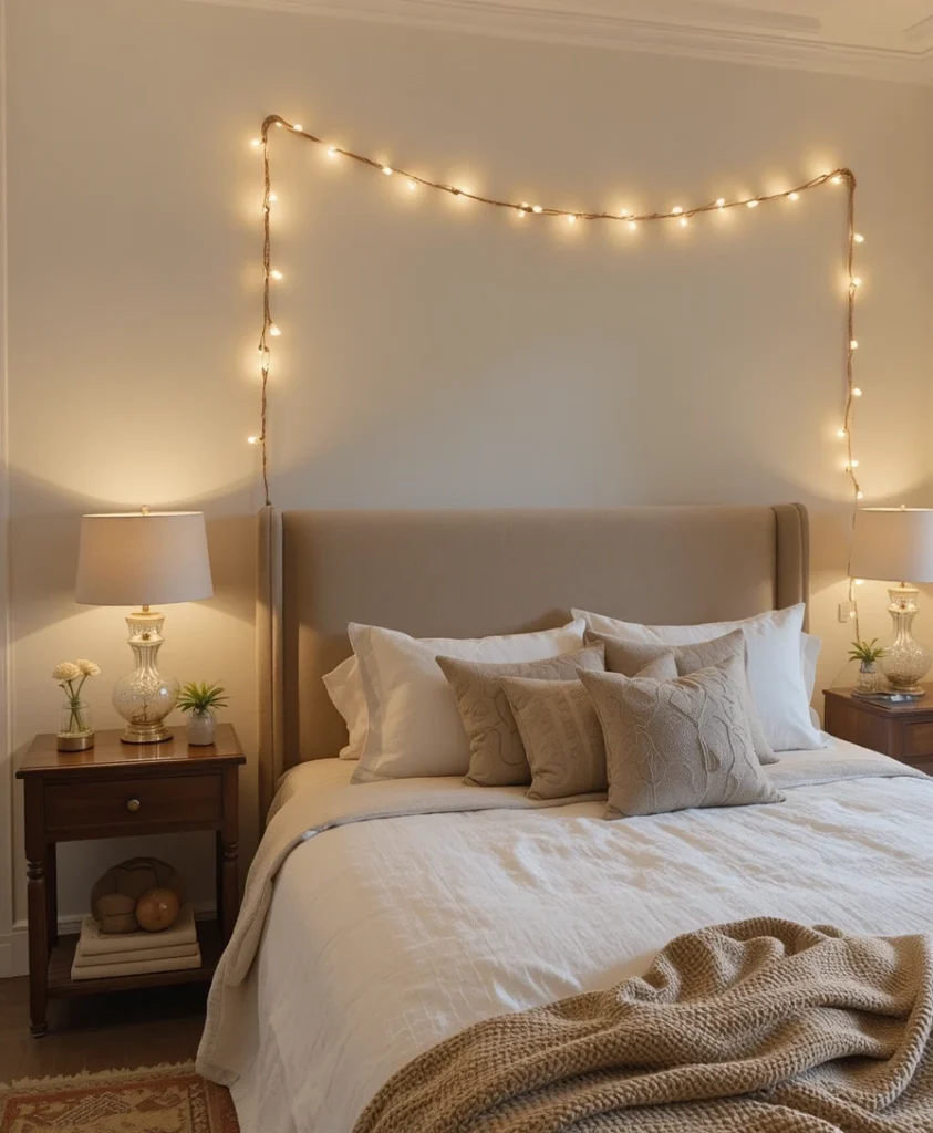 Lighting can make or break an Earthy Cozy Bedroom, and I always avoid harsh white lights. Instead, I go for warm-toned bulbs, table lamps, and soft string lights. This creates a golden glow that feels intimate and calming, especially during evenings.
