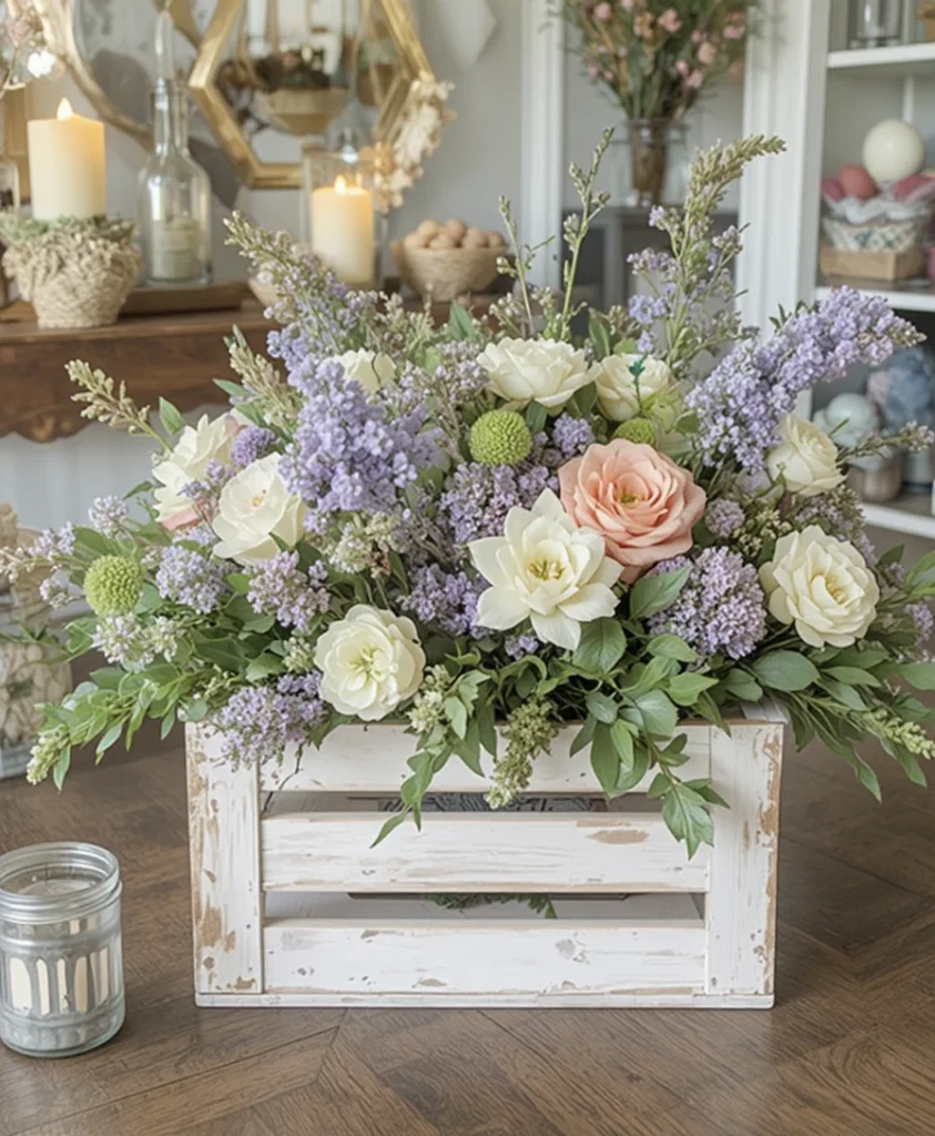 Using a small wooden crate as a base adds rustic charm. Filling it with layered flowers and greenery creates a grounded, earthy Easter Floral Arrangement that works beautifully on coffee tables or outdoor settings.