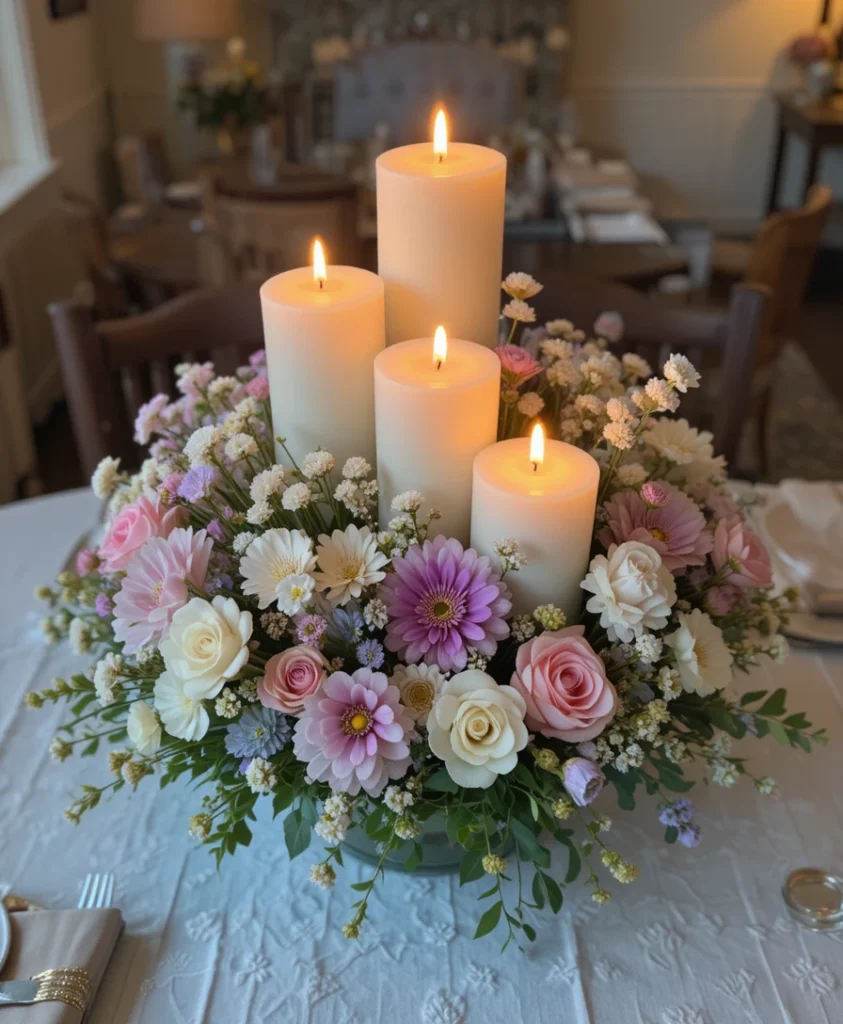 I often combine flowers with candles for a cozy atmosphere. Placing small blooms around pillar candles creates a warm, glowing Easter Floral Arrangement that feels intimate and inviting during evening gatherings.