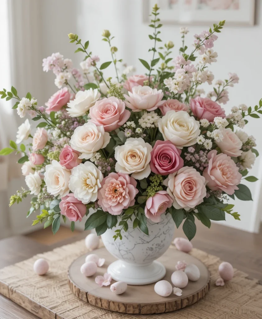 This is one of my most creative setups. I hollow out decorative eggs or use ceramic egg-shaped vases to hold vibrant tulips. The contrast between the playful container and fresh blooms makes this Easter Floral Arrangement truly unforgettable and perfect for festive tables.