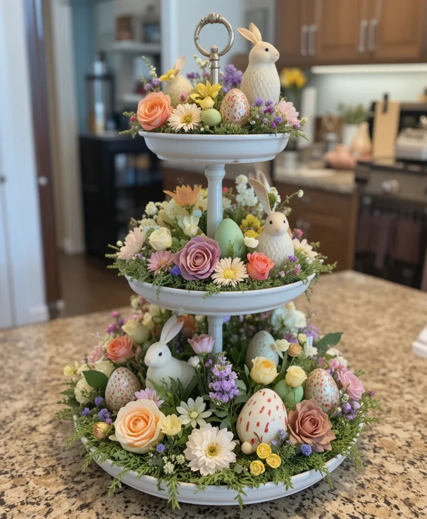 Using a tiered tray allows me to create a layered arrangement with small floral accents on each level. This playful Easter Floral Arrangement adds height and dimension, making it perfect for kitchen counters or dessert tables.