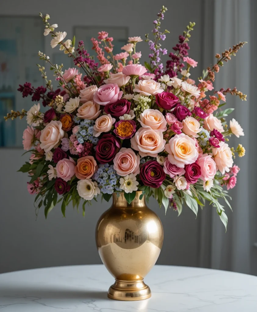 For a dramatic finish, I use a gold-toned vase filled with rich blooms like roses and ranunculus. This bold Easter Floral Arrangement instantly becomes a statement piece, adding a touch of glamour to the celebration.