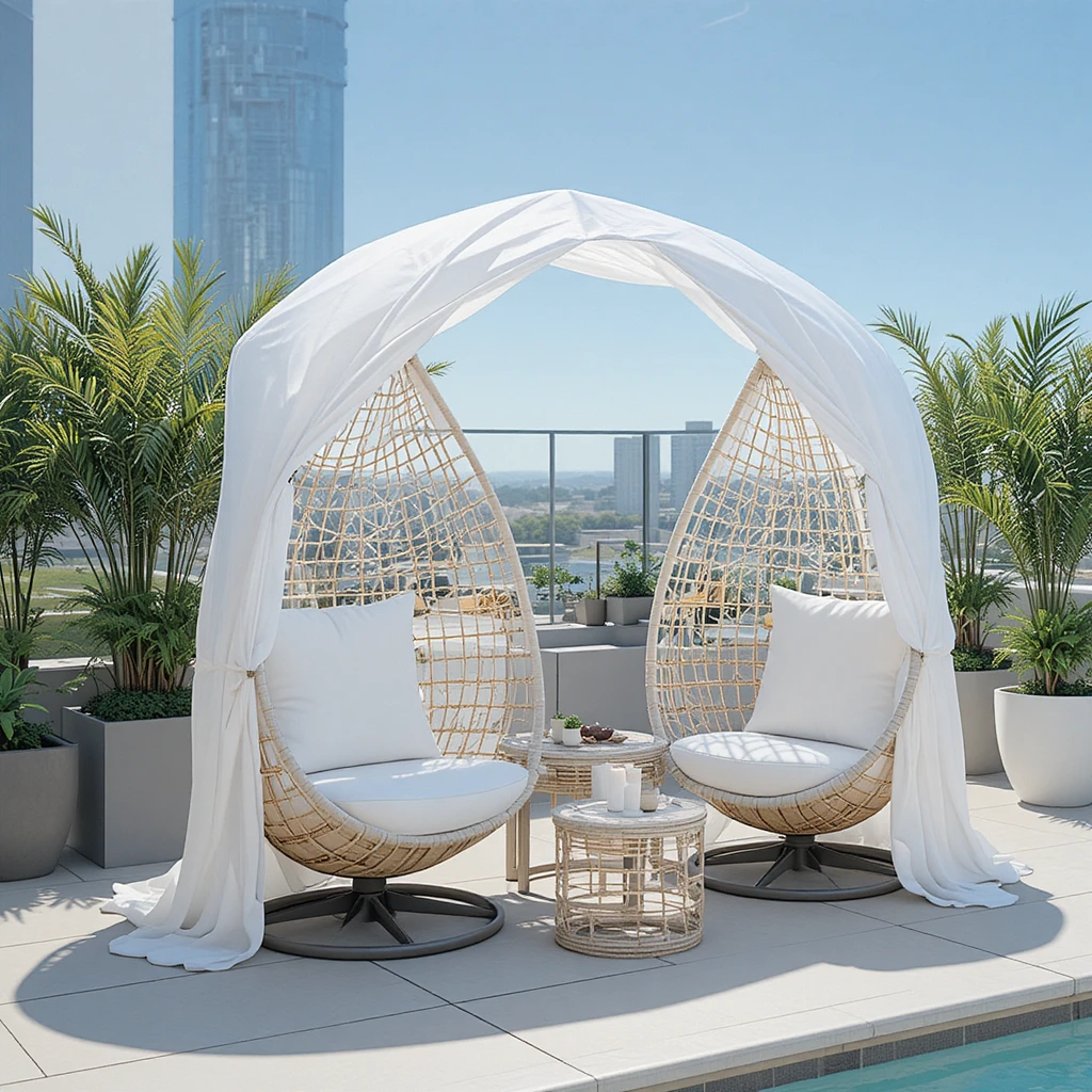 Canopy-equipped egg chairs enhance outdoor usability. Within egg chair ideas 2026, these designs provide shade and privacy, creating a retreat-like experience. They are ideal for gardens, poolside areas, or rooftop terraces.