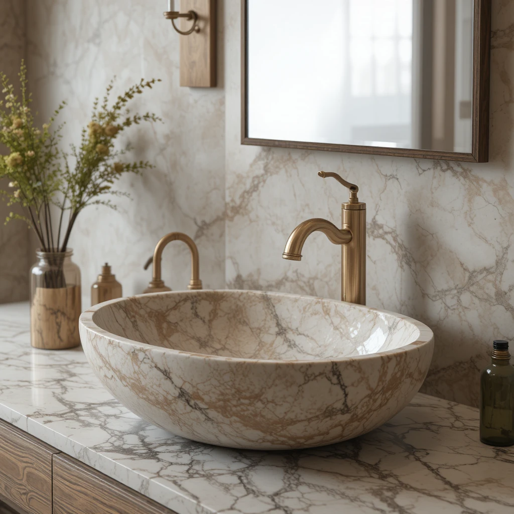Stone basins introduce earthy elegance with their unique patterns and textures. Choose marble, travertine, or granite to anchor the vanity in natural luxury. Their handcrafted appeal adds exclusivity and individuality. This element strengthens the elegant bathroom trend by merging nature with refined interiors.