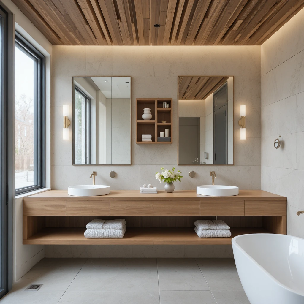 Wooden countertops, shelves, or ceiling slats bring warmth into an otherwise contemporary layout. Their natural tones soften sleek surfaces and make the space welcoming. When paired with stone or matte finishes, the balance feels modern yet grounded. This elegant bathroom trend blends warmth and refinement beautifully.