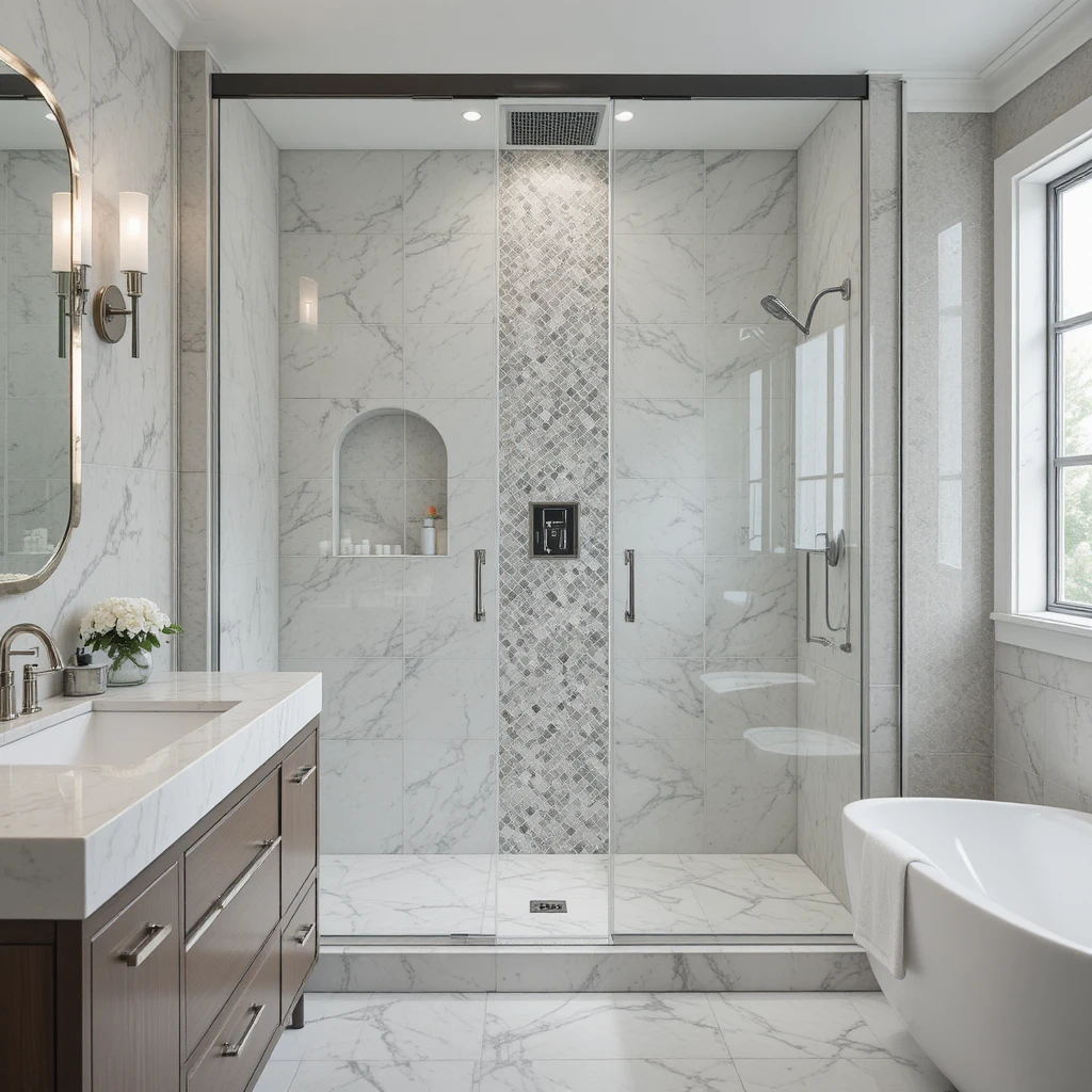 The elegant bathroom trend also highlights spacious walk-in showers with clear glass that creates a seamless flow. Large-format tiles reduce visual clutter and add a high-end aesthetic. Incorporate a rainfall shower head for spa-like comfort. The open design makes the bathroom feel significantly larger and more sophisticated.