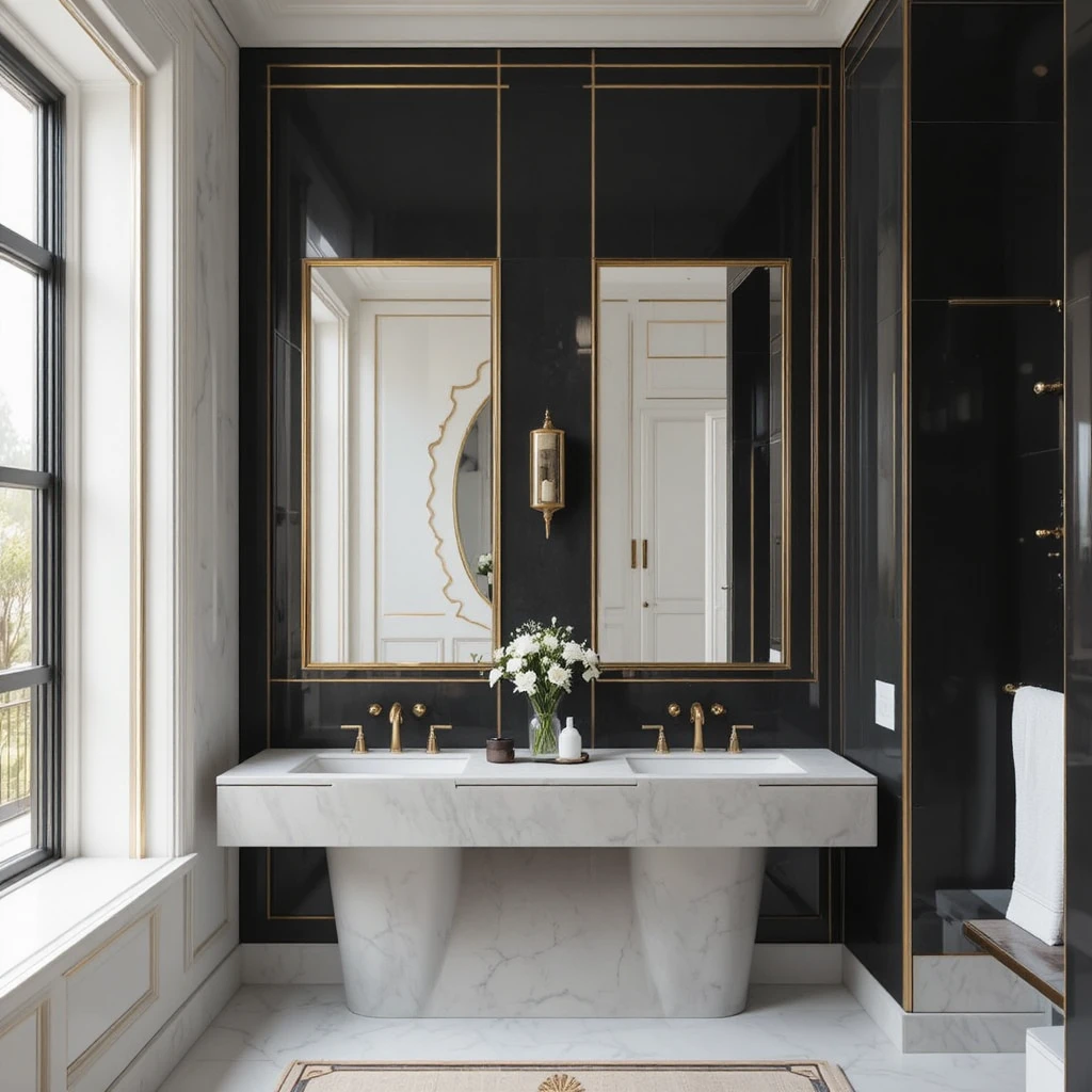 Incorporate thin metallic trims on tiles or mirrors to frame the design with sophistication. Brushed gold, silver, or rose gold can subtly elevate the overall look. These lines add a clean, couture-like finish to the bathroom. This elegant bathroom trend enhances structural elegance with minimal effort.