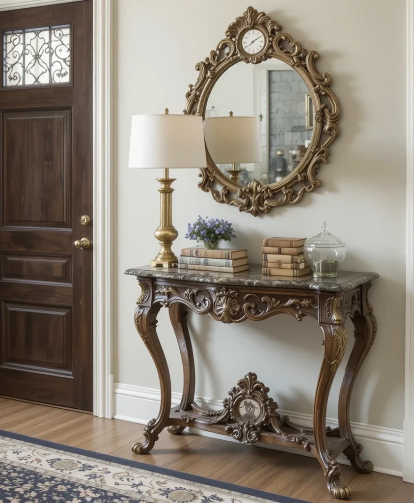 I’m drawn to an Entryway Table with intricate carvings and vintage-inspired details. I like pairing it with brass accents and a few old books for a classic look. The design feels elegant and slightly nostalgic. It gives my entryway a timeless charm that never feels outdated.