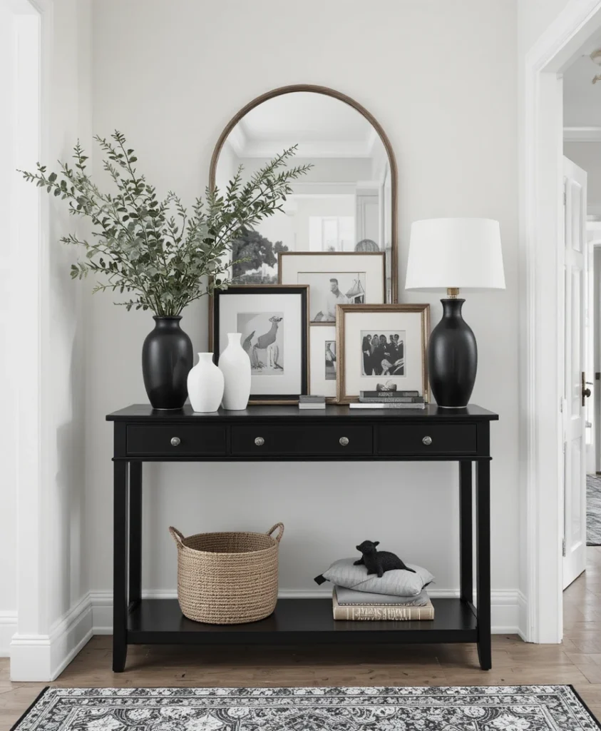 13. A Monochrome Entryway Table That Feels Effortlessly Chic