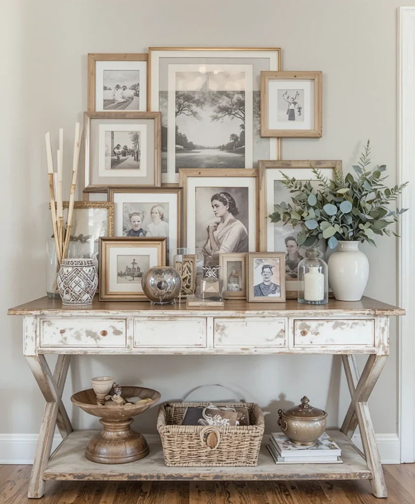 2. A Weathered Wood Entryway Table Filled with Timeless Charm